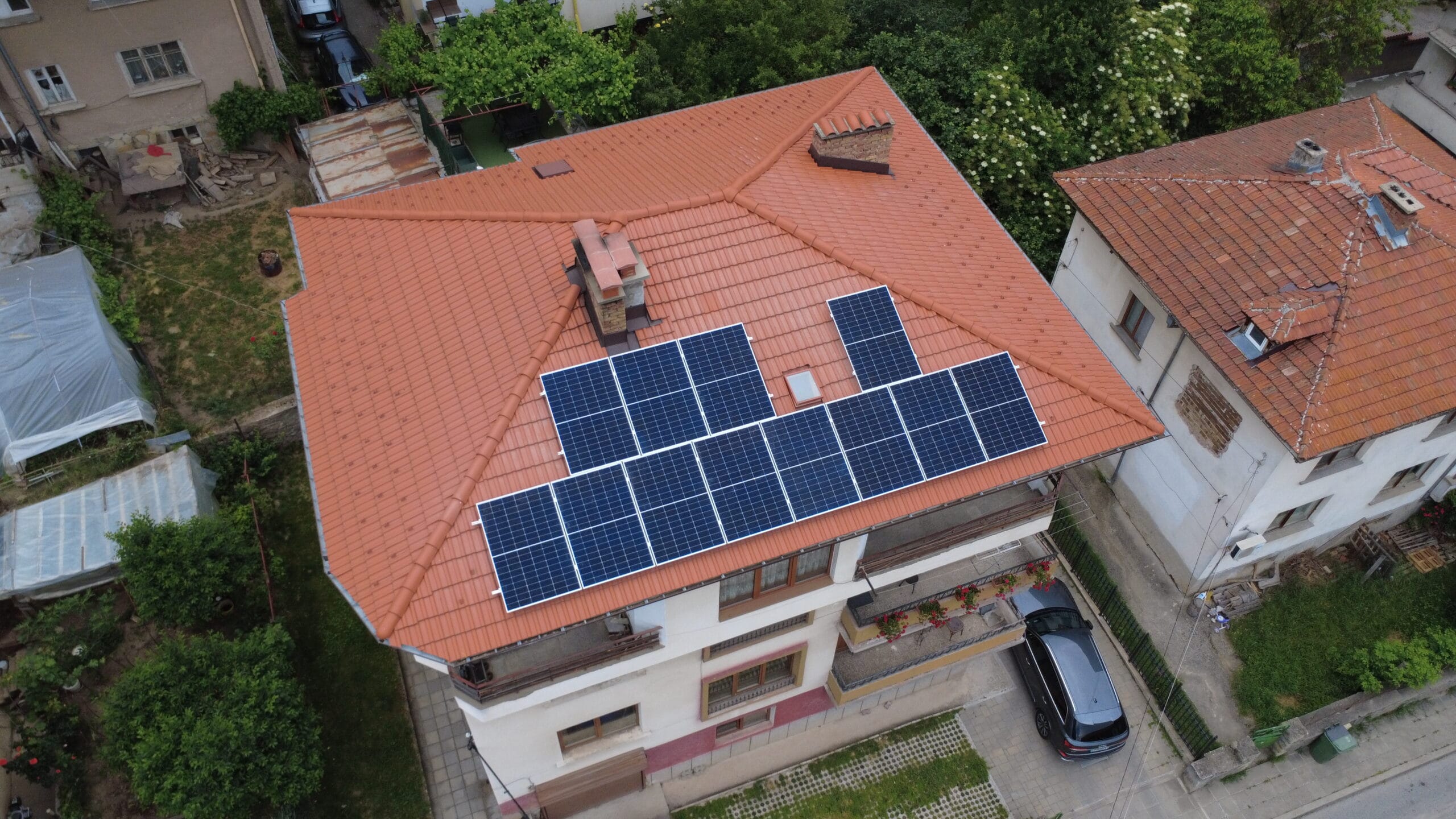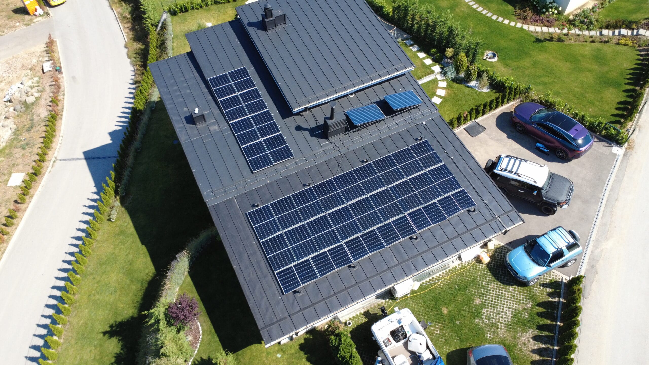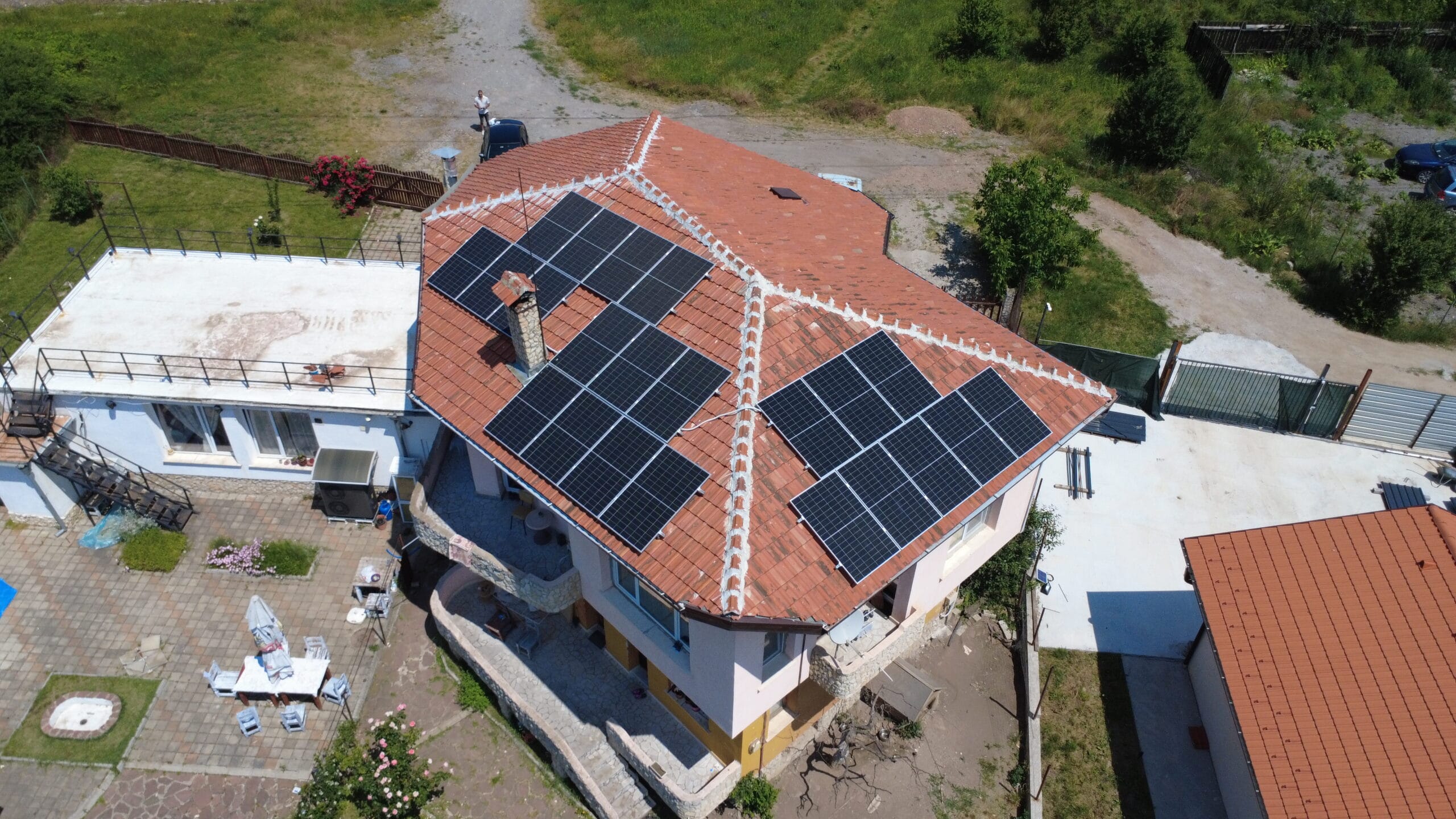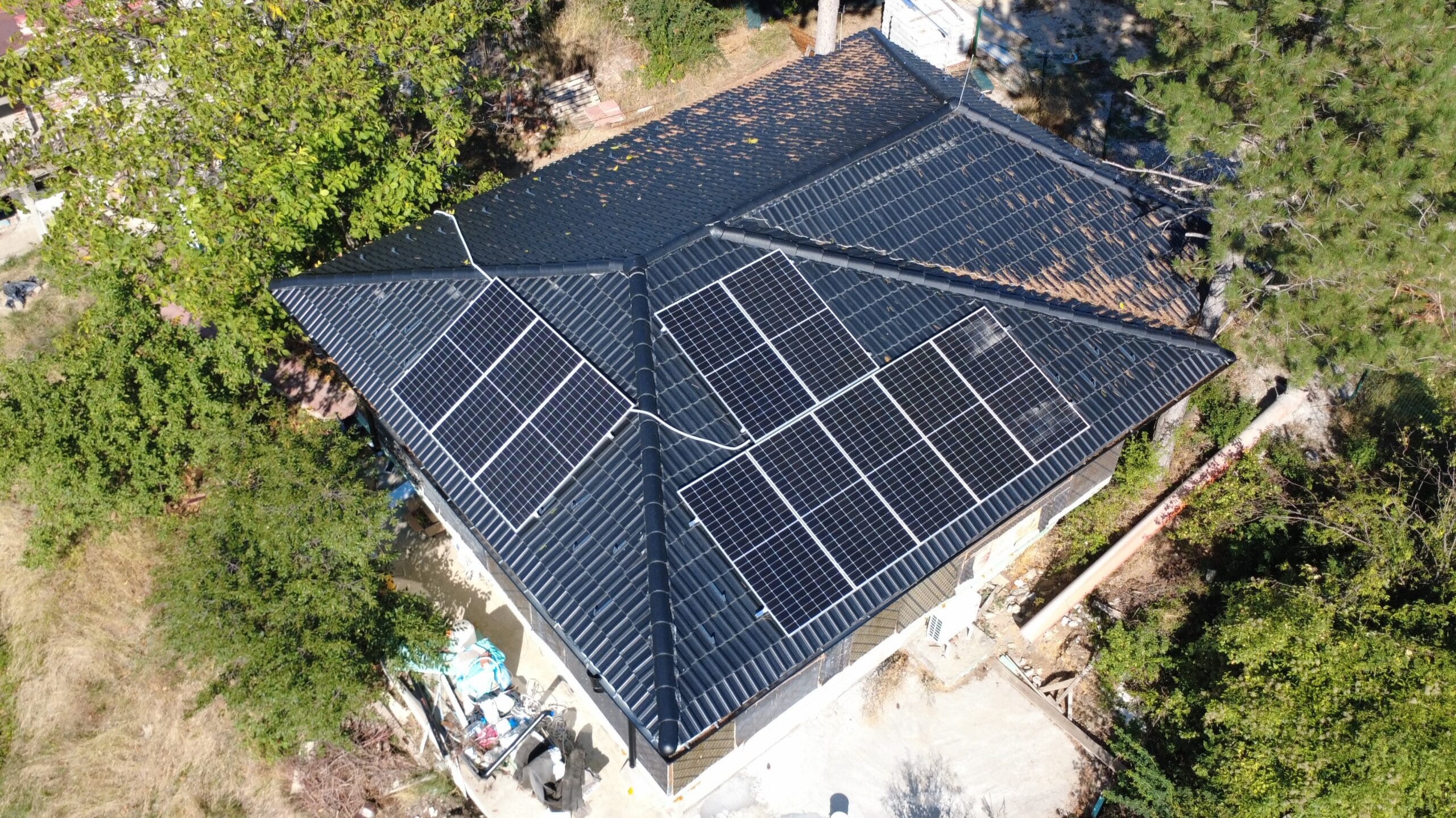 A hybrid photovoltaic system, mounted on a tiled roof and designed for self-consumption, with all generated energy utilized on-site and no surplus exported to the grid.