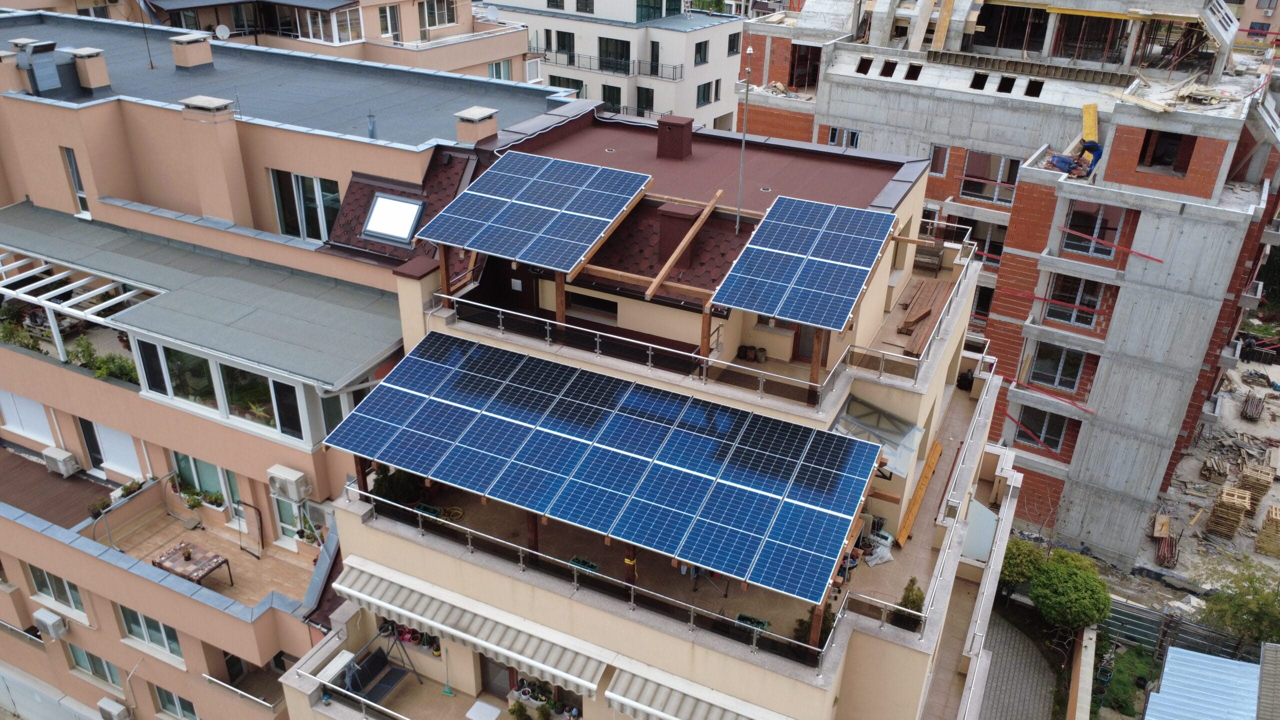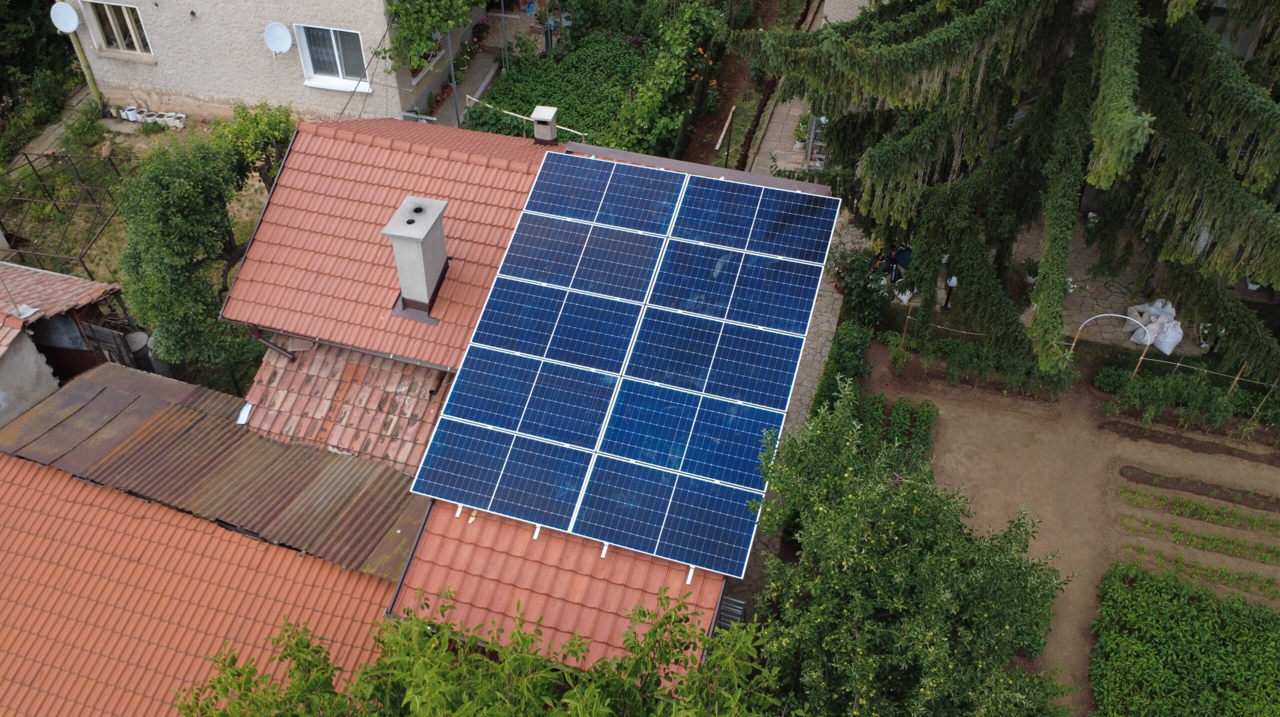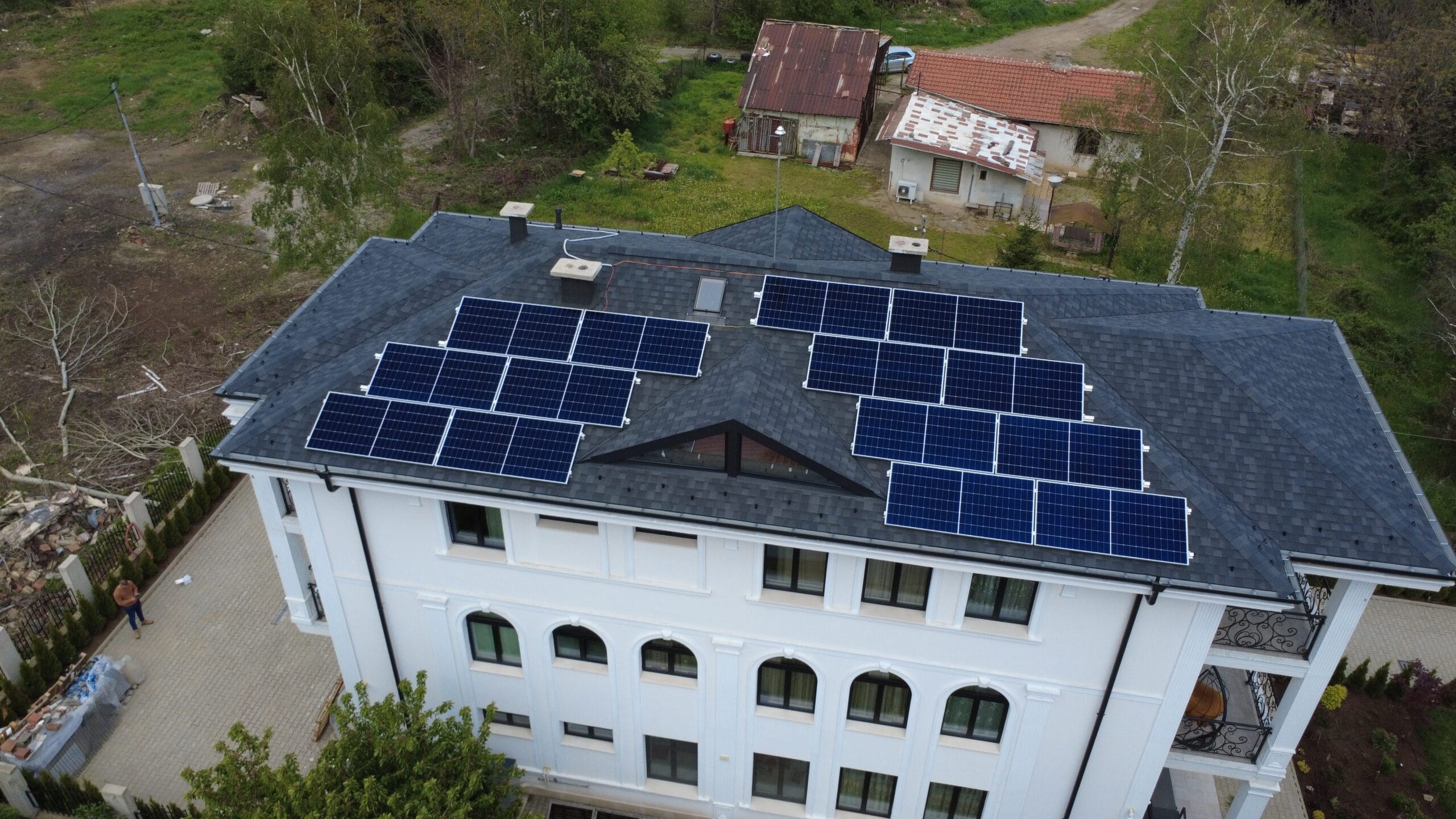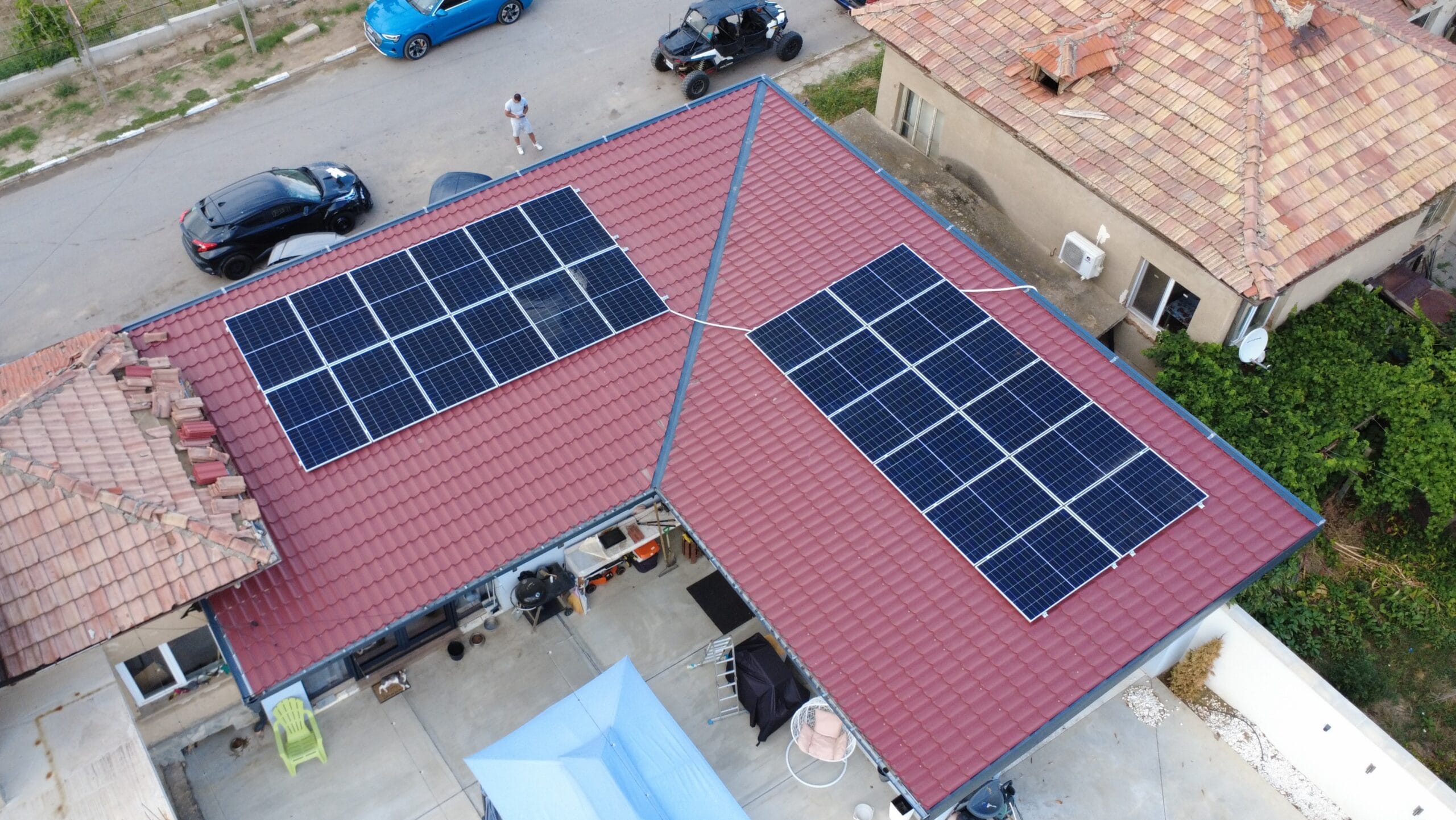 A hybrid photovoltaic system, mounted on a tiled roof and designed for self-consumption, with all generated energy utilized on-site and no surplus exported to the grid.