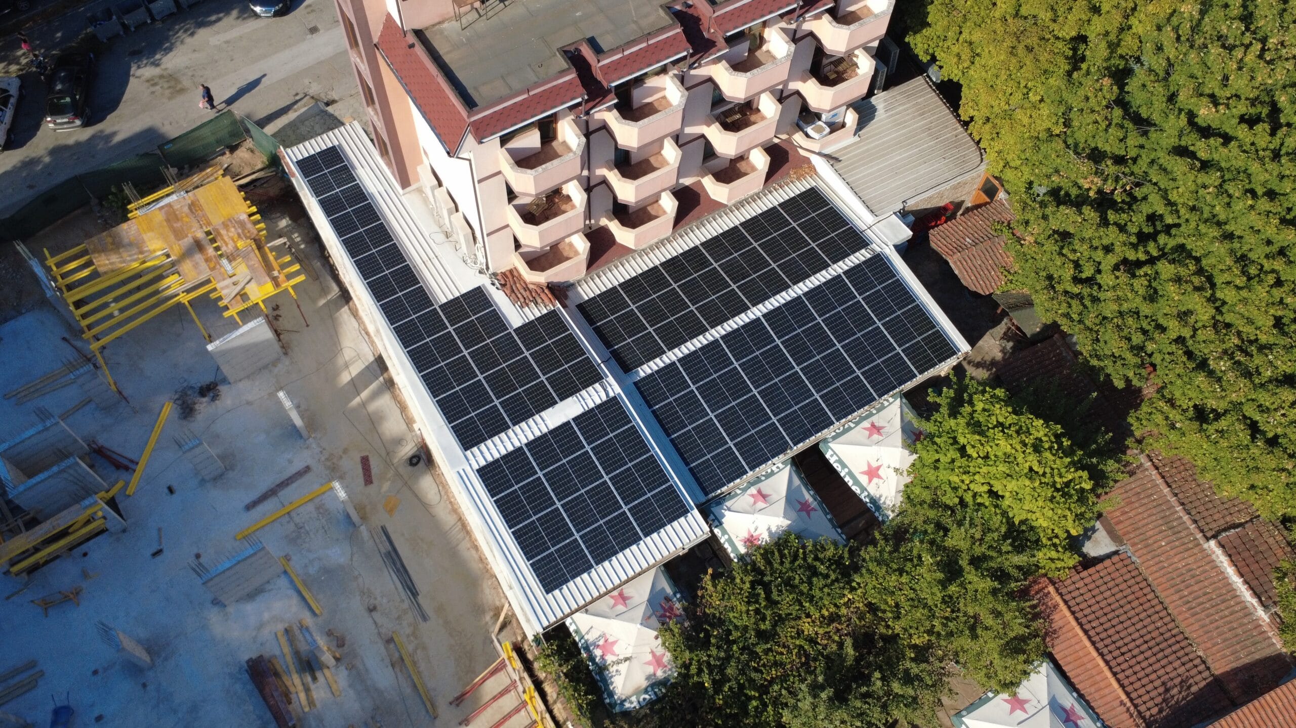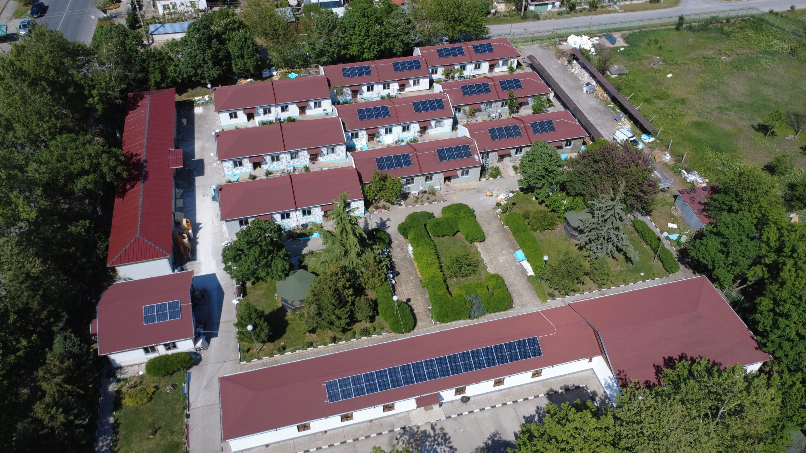 A grid-connected photovoltaic system designed and installed to provide electricity to residential buildings and facilities of a senior care home, funded by the European Union.